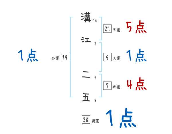 総運![]() | 溝江二五さんの総運は28画の1つ星!家庭環境に注意。スポーツで活躍できる能力があるかも。 あなたの人生を表す1番重要な運勢です。生涯を通じて影響する総合運となり、主に50歳以降の晩年期に影響を及ぼします。 |