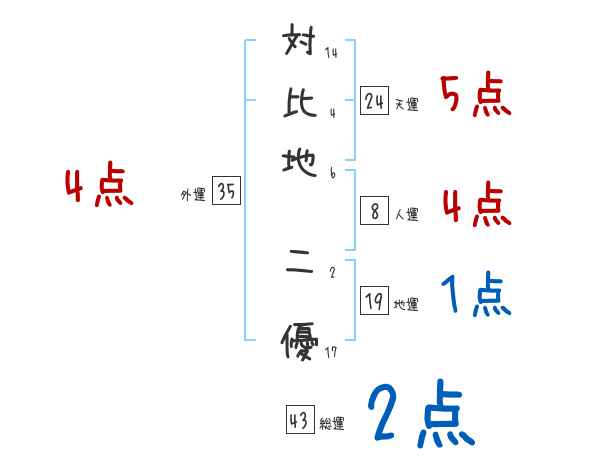総運![]() | 対比地二優さんの総運は43画の2つ星!頑固な性格で独立心が強いかも。やや非現実的で浪費に注意しましょう。 あなたの人生を表す1番重要な運勢です。生涯を通じて影響する総合運となり、主に50歳以降の晩年期に影響を及ぼします。 |