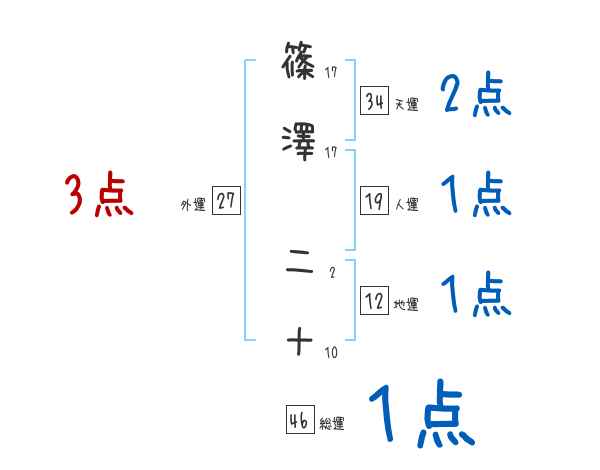 人運![]() | 篠澤二十さんの人運は19画の1つ星!優れた才能を持ちますが、協調性が足りないことも。周りの人と協力する事を意識しましょう。 性格や才能などを表す2番目に重要な運勢です。人間関係や協調性、社会的な成功に影響します。主に20歳から50歳ぐらいまでの中年期の運勢を表します。 |