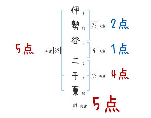 外運![]() | 伊勢谷二千夏さんの外運は32画の5つ星!柔軟性があり成功する。チャンスが多く金運が良い。 生活面を象徴する運勢です。外部から受ける影響力を表し、結婚運、家庭運や職場、環境への順応性を表します。 |