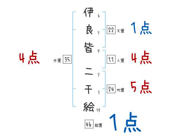 外運![]() | 伊良皆二千絵さんの外運は35画の4つ星!温厚な性格で感受性が高い。穏和な性格で人望が厚い。 生活面を象徴する運勢です。外部から受ける影響力を表し、結婚運、家庭運や職場、環境への順応性を表します。 |