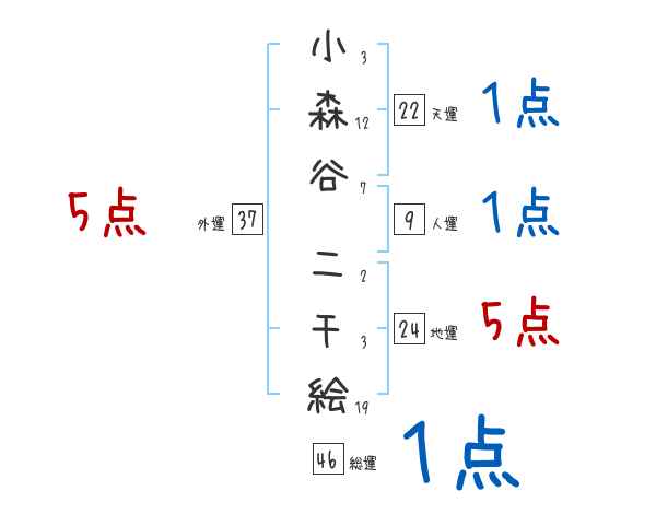 天運![]() | 小森谷二千絵さんの天運は22画の1つ星!努力することが苦手ないっぽう手先が器用。芸術性にも優れる。 家系が持つ宿命的な運勢を表します。祖先から受け継いだ苗字ですので自分の力が及びません。家柄を象徴します。 |