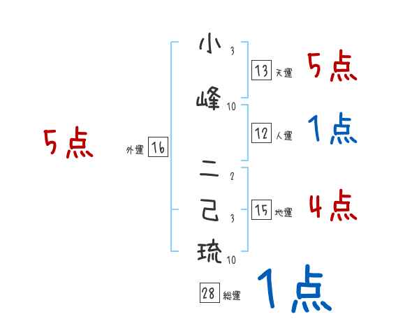 天運![]() | 小峰二己琉さんの天運は13画の5つ星!才能に恵まれ人気がある。名声を手に入れる。円満な人生。 家系が持つ宿命的な運勢を表します。祖先から受け継いだ苗字ですので自分の力が及びません。家柄を象徴します。 |