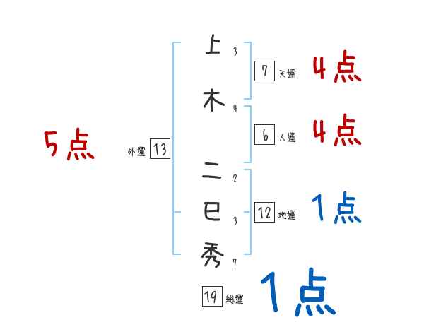 天運![]() | 上木二巳秀さんの天運は7画の4つ星!強い意志や信念を持ち独立心が強い。自立する。 家系が持つ宿命的な運勢を表します。祖先から受け継いだ苗字ですので自分の力が及びません。家柄を象徴します。 |