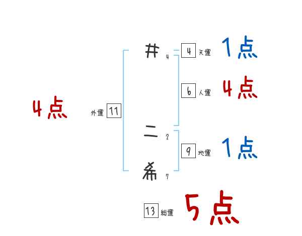 天運![]() | 井二希さんの天運は4画の1つ星!感情が不安定で苦労するかも。周囲との協調を心掛けましょう。 家系が持つ宿命的な運勢を表します。祖先から受け継いだ苗字ですので自分の力が及びません。家柄を象徴します。 |