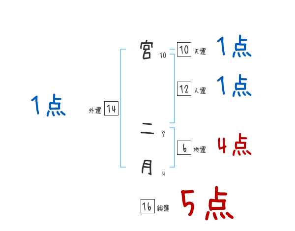 天運![]() | 宮二月さんの天運は10画の1つ星!不安を感じやすい傾向。ストレスを抱えないように注意しましょう。 家系が持つ宿命的な運勢を表します。祖先から受け継いだ苗字ですので自分の力が及びません。家柄を象徴します。 |