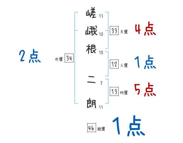 総運![]() | 嵯峨根二朗さんの総運は46画の1つ星!迷走することが多く苦労するかも。目先のことにとらわれないように。 あなたの人生を表す1番重要な運勢です。生涯を通じて影響する総合運となり、主に50歳以降の晩年期に影響を及ぼします。 |
