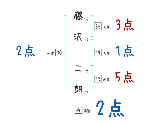 天運![]() | 藤沢二朗さんの天運は36画の3つ星!先見性が豊かです。多少神経質で苦労することも。 家系が持つ宿命的な運勢を表します。祖先から受け継いだ苗字ですので自分の力が及びません。家柄を象徴します。 |