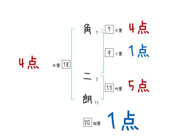 天運![]() | 角二朗さんの天運は7画の4つ星!強い意志や信念を持ち独立心が強い。自立する。 家系が持つ宿命的な運勢を表します。祖先から受け継いだ苗字ですので自分の力が及びません。家柄を象徴します。 |