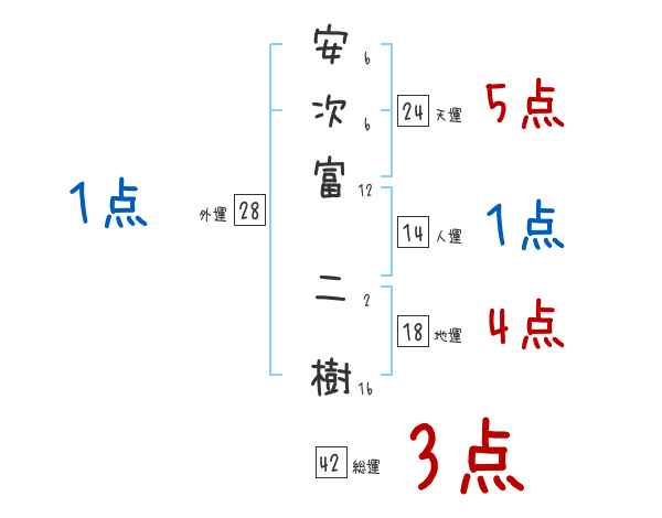 天運![]() | 安次富二樹さんの天運は24画の5つ星!家庭運が良く順調な人生。金運にも恵まれる。 家系が持つ宿命的な運勢を表します。祖先から受け継いだ苗字ですので自分の力が及びません。家柄を象徴します。 |