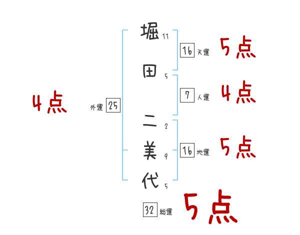 総運![]() | 堀田二美代さんの総運は32画の5つ星!柔軟性があり成功する。チャンスが多く金運が良い。 あなたの人生を表す1番重要な運勢です。生涯を通じて影響する総合運となり、主に50歳以降の晩年期に影響を及ぼします。 |