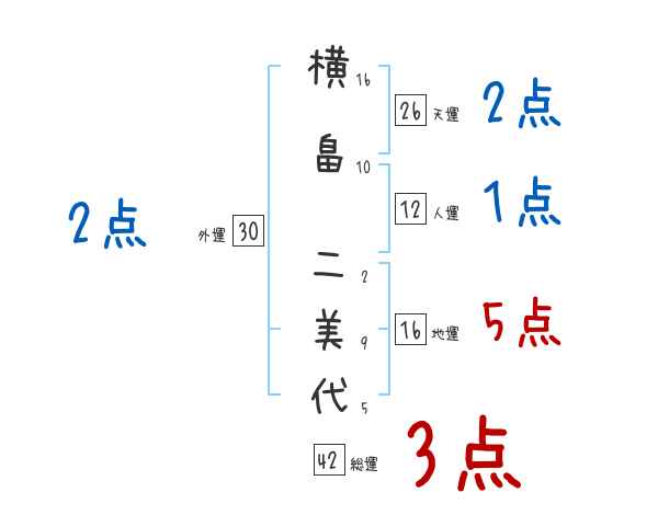 天運![]() | 横畠二美代さんの天運は26画の2つ星!波瀾万丈かも。信頼できる人を大事にしましょう。 家系が持つ宿命的な運勢を表します。祖先から受け継いだ苗字ですので自分の力が及びません。家柄を象徴します。 |
