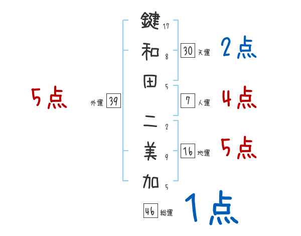 外運![]() | 鍵和田二美加さんの外運は39画の5つ星!社交性に優れ人望が厚い。人の上に立ち成功する。 生活面を象徴する運勢です。外部から受ける影響力を表し、結婚運、家庭運や職場、環境への順応性を表します。 |