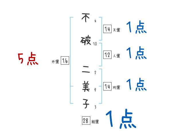 外運![]() | 不破二美子さんの外運は16画の5つ星!人望が厚く大きく発展する。逆転成功が見える。 生活面を象徴する運勢です。外部から受ける影響力を表し、結婚運、家庭運や職場、環境への順応性を表します。 |