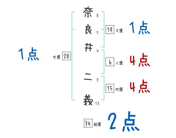 総運![]() | 奈良井二義さんの総運は34画の2つ星!独創性に優れるが、自尊心が強く災難に注意しましょう。 あなたの人生を表す1番重要な運勢です。生涯を通じて影響する総合運となり、主に50歳以降の晩年期に影響を及ぼします。 |