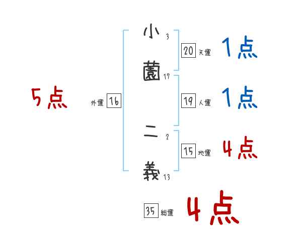 総運![]() | 小薗二義さんの総運は35画の4つ星!温厚な性格で感受性が高い。穏和な性格で人望が厚い。 あなたの人生を表す1番重要な運勢です。生涯を通じて影響する総合運となり、主に50歳以降の晩年期に影響を及ぼします。 |