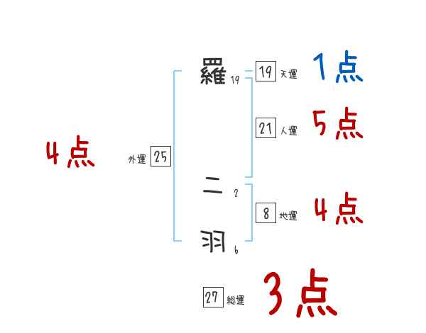 天運![]() | 羅二羽さんの天運は19画の1つ星!優れた才能を持ちますが、協調性が足りないことも。周りの人と協力する事を意識しましょう。 家系が持つ宿命的な運勢を表します。祖先から受け継いだ苗字ですので自分の力が及びません。家柄を象徴します。 |