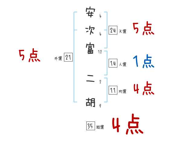 外運![]() | 安次富二胡さんの外運は21画の5つ星!統率力がある。独立し成功する。名誉を手に入れる。 生活面を象徴する運勢です。外部から受ける影響力を表し、結婚運、家庭運や職場、環境への順応性を表します。 |