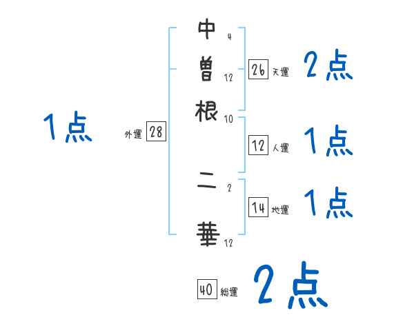 外運![]() | 中曽根二華さんの外運は28画の1つ星!家庭環境に注意。スポーツで活躍できる能力があるかも。 生活面を象徴する運勢です。外部から受ける影響力を表し、結婚運、家庭運や職場、環境への順応性を表します。 |