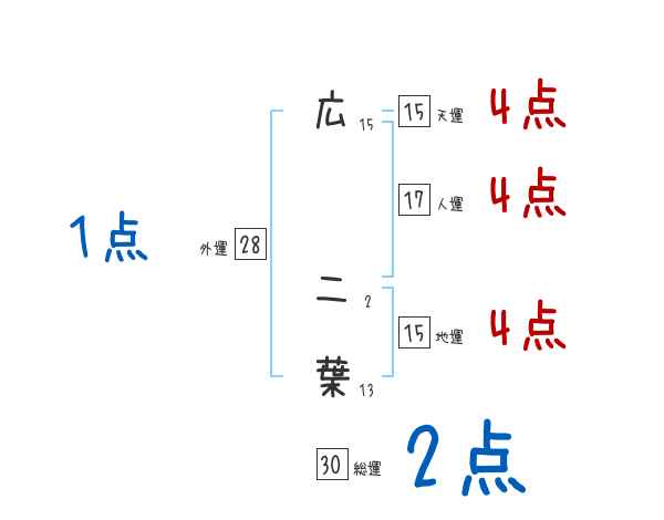 天運![]() | 広二葉さんの天運は15画の4つ星!人徳があり出世する。順調に物事を進め円満な人生。 家系が持つ宿命的な運勢を表します。祖先から受け継いだ苗字ですので自分の力が及びません。家柄を象徴します。 |