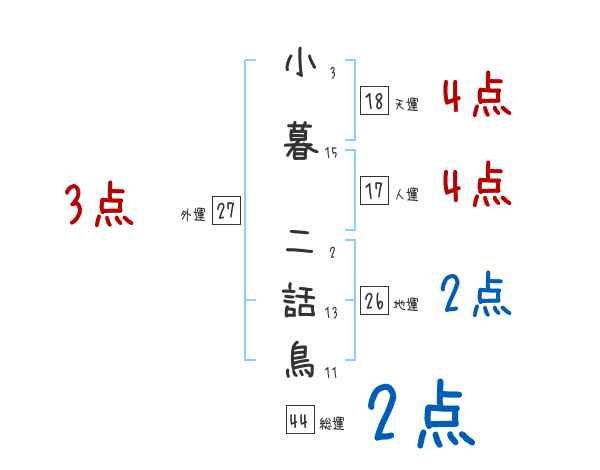 総運![]() | 小暮二話鳥さんの総運は44画の2つ星!誠実で慎重な性格。物事を考えすぎないように注意しましょう。 あなたの人生を表す1番重要な運勢です。生涯を通じて影響する総合運となり、主に50歳以降の晩年期に影響を及ぼします。 |