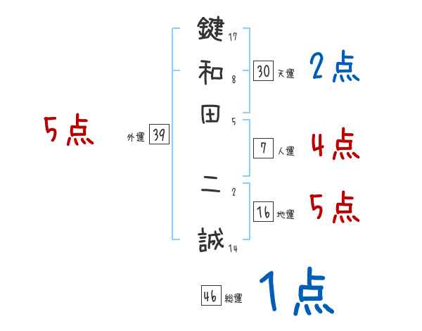 天運![]() | 鍵和田二誠さんの天運は30画の2つ星!浮き沈みの激しさに注意しましょう。 家系が持つ宿命的な運勢を表します。祖先から受け継いだ苗字ですので自分の力が及びません。家柄を象徴します。 |