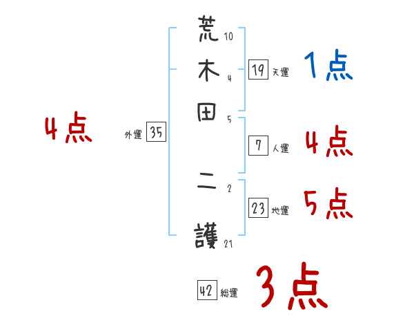 外運![]() | 荒木田二護さんの外運は35画の4つ星!温厚な性格で感受性が高い。穏和な性格で人望が厚い。 生活面を象徴する運勢です。外部から受ける影響力を表し、結婚運、家庭運や職場、環境への順応性を表します。 |