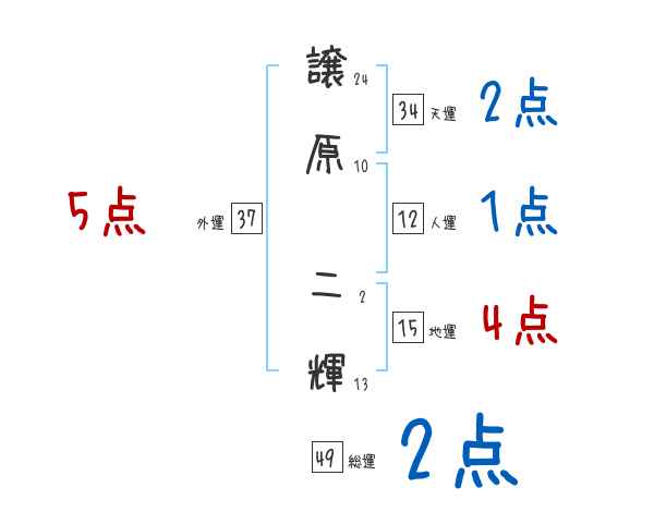 天運![]() | 譲原二輝さんの天運は34画の2つ星!独創性に優れるが、自尊心が強く災難に注意しましょう。 家系が持つ宿命的な運勢を表します。祖先から受け継いだ苗字ですので自分の力が及びません。家柄を象徴します。 |