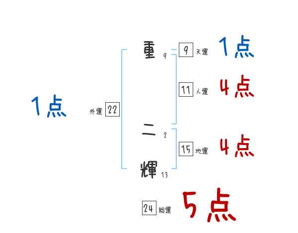 天運![]() | 重二輝さんの天運は9画の1つ星!消極的で才能を発揮することが苦手なことも。周りの意見に耳を傾けましょう。 家系が持つ宿命的な運勢を表します。祖先から受け継いだ苗字ですので自分の力が及びません。家柄を象徴します。 |