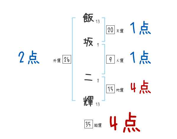 外運![]() | 飯坂二輝さんの外運は26画の2つ星!波瀾万丈かも。信頼できる人を大事にしましょう。 生活面を象徴する運勢です。外部から受ける影響力を表し、結婚運、家庭運や職場、環境への順応性を表します。 |