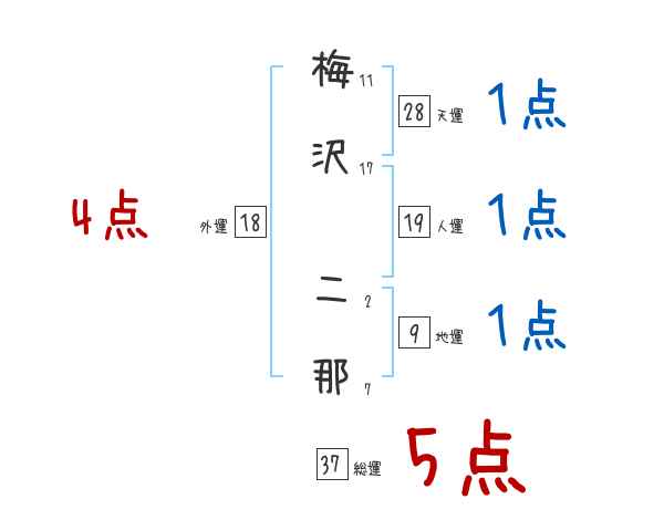 天運![]() | 梅沢二那さんの天運は28画の1つ星!家庭環境に注意。スポーツで活躍できる能力があるかも。 家系が持つ宿命的な運勢を表します。祖先から受け継いだ苗字ですので自分の力が及びません。家柄を象徴します。 |