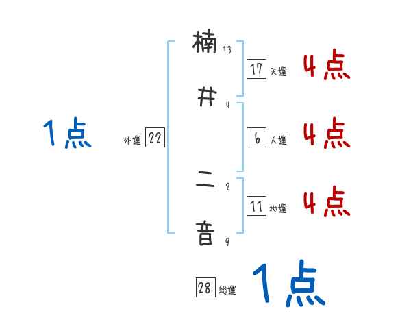 総運![]() | 楠井二音さんの総運は28画の1つ星!家庭環境に注意。スポーツで活躍できる能力があるかも。 あなたの人生を表す1番重要な運勢です。生涯を通じて影響する総合運となり、主に50歳以降の晩年期に影響を及ぼします。 |