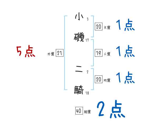 外運![]() | 小磯二騎さんの外運は21画の5つ星!統率力がある。独立し成功する。名誉を手に入れる。 生活面を象徴する運勢です。外部から受ける影響力を表し、結婚運、家庭運や職場、環境への順応性を表します。 |