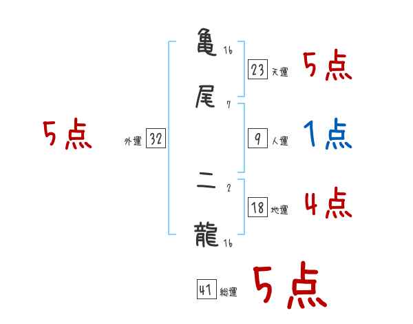 天運![]() | 亀尾二龍さんの天運は23画の5つ星!想像力に優れ活力がある。一代で成功し名誉を手に入れる。 家系が持つ宿命的な運勢を表します。祖先から受け継いだ苗字ですので自分の力が及びません。家柄を象徴します。 |