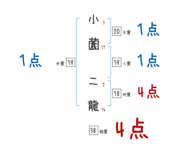 人運![]() | 小薗二龍さんの人運は19画の1つ星!優れた才能を持ちますが、協調性が足りないことも。周りの人と協力する事を意識しましょう。 性格や才能などを表す2番目に重要な運勢です。人間関係や協調性、社会的な成功に影響します。主に20歳から50歳ぐらいまでの中年期の運勢を表します。 |