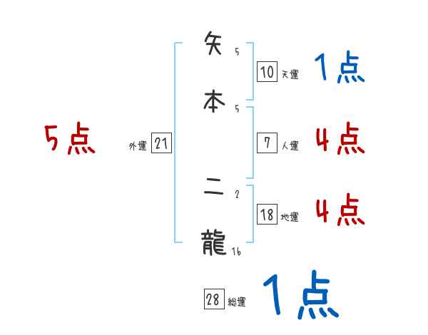 天運![]() | 矢本二龍さんの天運は10画の1つ星!不安を感じやすい傾向。ストレスを抱えないように注意しましょう。 家系が持つ宿命的な運勢を表します。祖先から受け継いだ苗字ですので自分の力が及びません。家柄を象徴します。 |