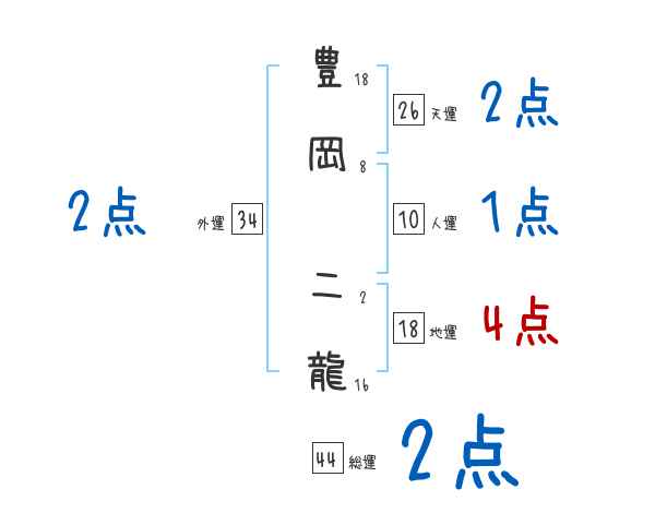天運![]() | 豊岡二龍さんの天運は26画の2つ星!波瀾万丈かも。信頼できる人を大事にしましょう。 家系が持つ宿命的な運勢を表します。祖先から受け継いだ苗字ですので自分の力が及びません。家柄を象徴します。 |