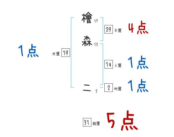 外運![]() | 檜森二さんの外運は19画の1つ星!優れた才能を持ちますが、協調性が足りないことも。周りの人と協力する事を意識しましょう。 生活面を象徴する運勢です。外部から受ける影響力を表し、結婚運、家庭運や職場、環境への順応性を表します。 |