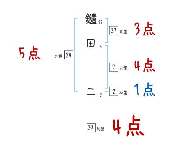 総運![]() | 鑓田二さんの総運は29画の4つ星!完全主義で才能がある。厳格な心の持ち主。 あなたの人生を表す1番重要な運勢です。生涯を通じて影響する総合運となり、主に50歳以降の晩年期に影響を及ぼします。 |