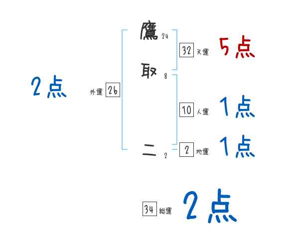 天運![]() | 鷹取二さんの天運は32画の5つ星!柔軟性があり成功する。チャンスが多く金運が良い。 家系が持つ宿命的な運勢を表します。祖先から受け継いだ苗字ですので自分の力が及びません。家柄を象徴します。 |