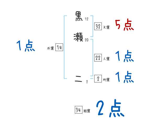 天運![]() | 黒瀬二さんの天運は32画の5つ星!柔軟性があり成功する。チャンスが多く金運が良い。 家系が持つ宿命的な運勢を表します。祖先から受け継いだ苗字ですので自分の力が及びません。家柄を象徴します。 |