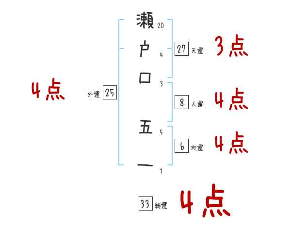 天運![]() | 瀬戸口五一さんの天運は27画の3つ星!頭脳明晰だが強情で摩擦が多い傾向。孤立に注意。 家系が持つ宿命的な運勢を表します。祖先から受け継いだ苗字ですので自分の力が及びません。家柄を象徴します。 |