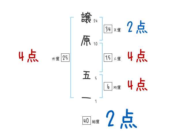 総運![]() | 譲原五一さんの総運は40画の2つ星!自信過剰で物事に固執するためトラブルに注意。 あなたの人生を表す1番重要な運勢です。生涯を通じて影響する総合運となり、主に50歳以降の晩年期に影響を及ぼします。 |