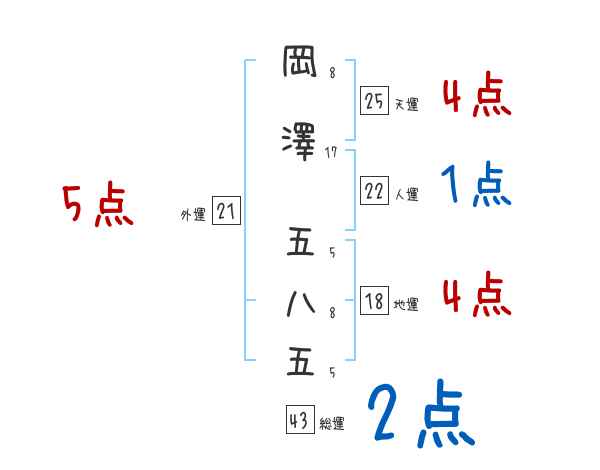 総運![]() | 岡澤五八五さんの総運は43画の2つ星!頑固な性格で独立心が強いかも。やや非現実的で浪費に注意しましょう。 あなたの人生を表す1番重要な運勢です。生涯を通じて影響する総合運となり、主に50歳以降の晩年期に影響を及ぼします。 |