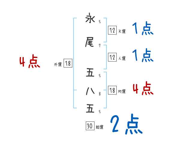 天運![]() | 永尾五八五さんの天運は12画の1つ星!簡単な失敗で諦めてしまいやすいかも。着実に行動すると良いでしょう。 家系が持つ宿命的な運勢を表します。祖先から受け継いだ苗字ですので自分の力が及びません。家柄を象徴します。 |
