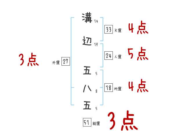 総運![]() | 溝辺五八五さんの総運は51画の3つ星!変化が激しく、危険に注意。堅実な性格。 あなたの人生を表す1番重要な運勢です。生涯を通じて影響する総合運となり、主に50歳以降の晩年期に影響を及ぼします。 |