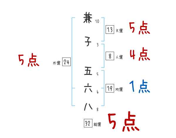 総運![]() | 兼子五六八さんの総運は32画の5つ星!柔軟性があり成功する。チャンスが多く金運が良い。 あなたの人生を表す1番重要な運勢です。生涯を通じて影響する総合運となり、主に50歳以降の晩年期に影響を及ぼします。 |