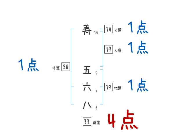 人運![]() | 寿五六八さんの人運は19画の1つ星!優れた才能を持ちますが、協調性が足りないことも。周りの人と協力する事を意識しましょう。 性格や才能などを表す2番目に重要な運勢です。人間関係や協調性、社会的な成功に影響します。主に20歳から50歳ぐらいまでの中年期の運勢を表します。 |