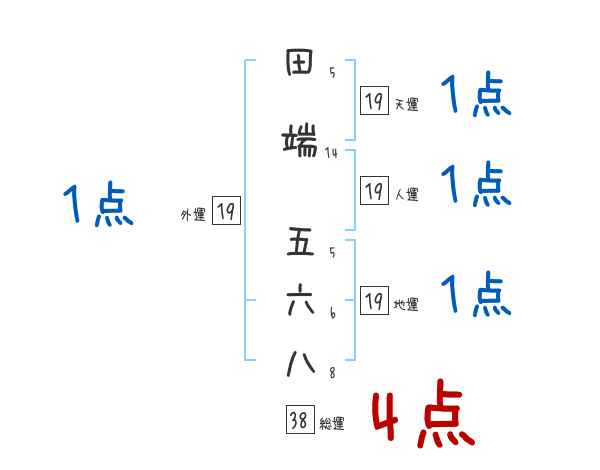 人運![]() | 田端五六八さんの人運は19画の1つ星!優れた才能を持ちますが、協調性が足りないことも。周りの人と協力する事を意識しましょう。 性格や才能などを表す2番目に重要な運勢です。人間関係や協調性、社会的な成功に影響します。主に20歳から50歳ぐらいまでの中年期の運勢を表します。 |