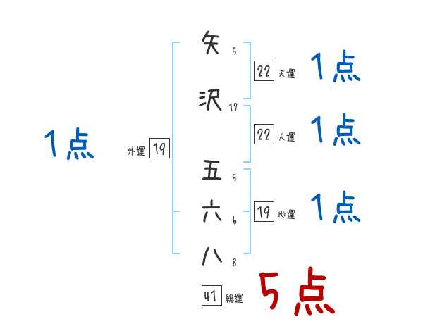 天運![]() | 矢沢五六八さんの天運は22画の1つ星!努力することが苦手ないっぽう手先が器用。芸術性にも優れる。 家系が持つ宿命的な運勢を表します。祖先から受け継いだ苗字ですので自分の力が及びません。家柄を象徴します。 |